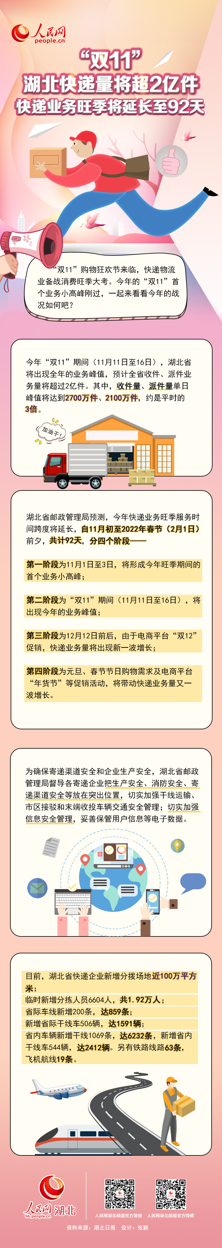 “雙11”湖北快遞量將超2億件 快遞業(yè)務(wù)旺季將延長至92天