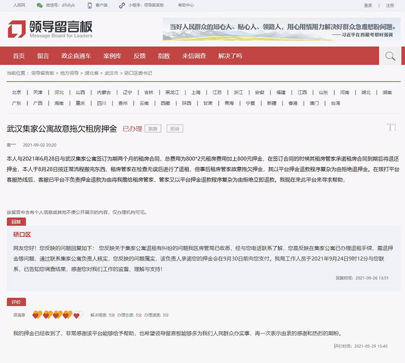 9月29日,網(wǎng)友南***評(píng)價(jià):押金已收到,感謝人民網(wǎng)“領(lǐng)導(dǎo)留言板”給予幫助。