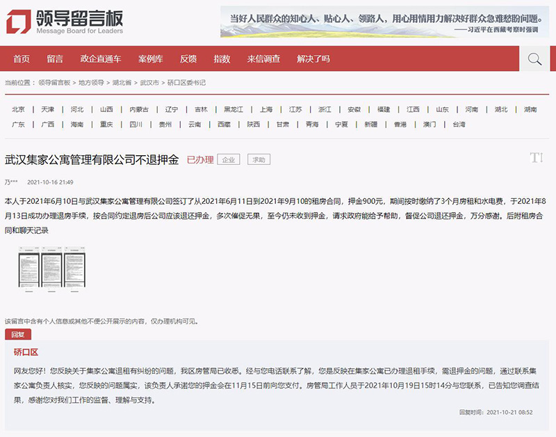 網(wǎng)友南***9月2日在人民網(wǎng)“領(lǐng)導(dǎo)留言板”留言,2021年6月28日與武漢集家公寓簽訂為期兩個(gè)月的租房合同,總費(fèi)用為房租1600元加上押金800元,在簽訂合同時(shí)其租房管家承諾租房合同到期后將退還押金,8月28日按正常流程辦理退租后,租房管家以平臺(tái)押金退款程序復(fù)雜為由拒絕退押金!霸趽艽蚱脚_(tái)客服熱線后,客服以不負(fù)責(zé)押金退款為由將我推給租房管家,管家又以平臺(tái)押金退款程序復(fù)雜為由拒絕立即退款!