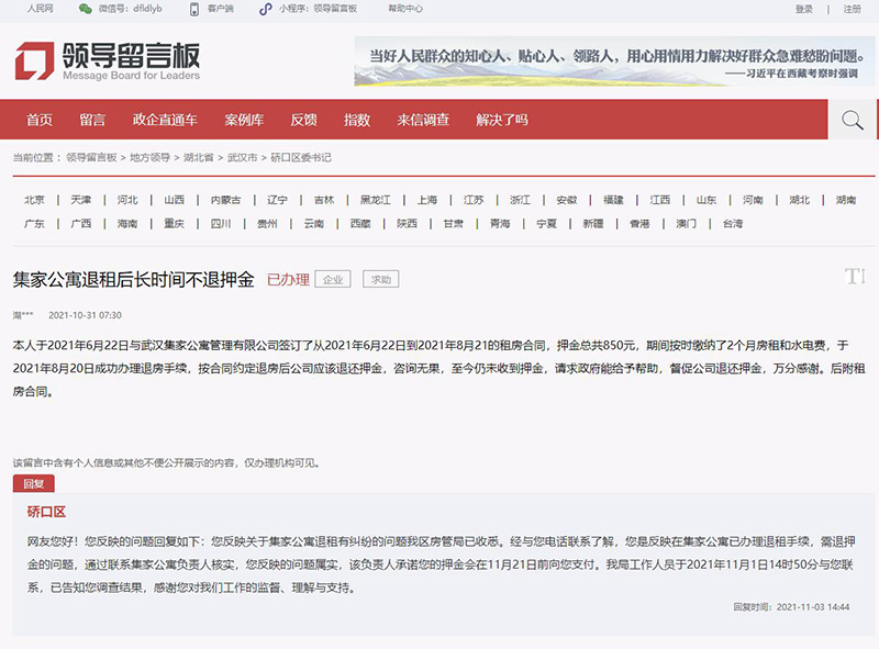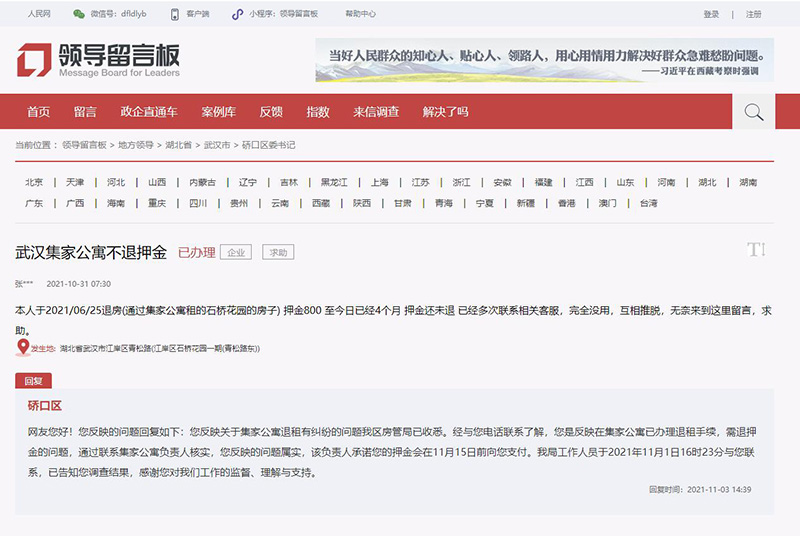 “4個(gè)月了,押金還未退”“押金未按時(shí)退還,多次催促無果”……近日,多名網(wǎng)友在人民網(wǎng)“領(lǐng)導(dǎo)留言板”反映武漢集家公寓退租后押金遲遲不退的問題,針對(duì)部分網(wǎng)友留言,武漢市硚口區(qū)回復(fù)了集家公寓負(fù)責(zé)人承諾的退款時(shí)間。