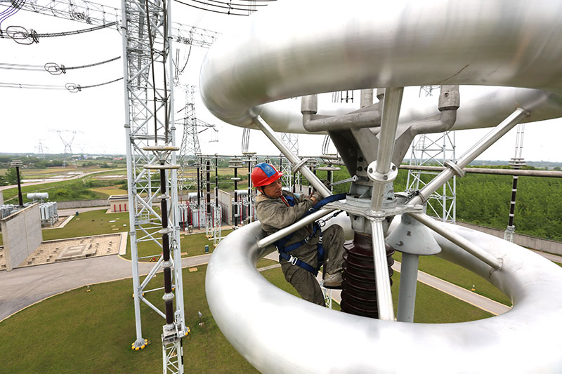 國網(wǎng)湖北檢修公司對1000千伏特高壓站均壓環(huán)螺栓進行緊固,助力大電網(wǎng)安全穩(wěn)定運行。黎金勇攝
