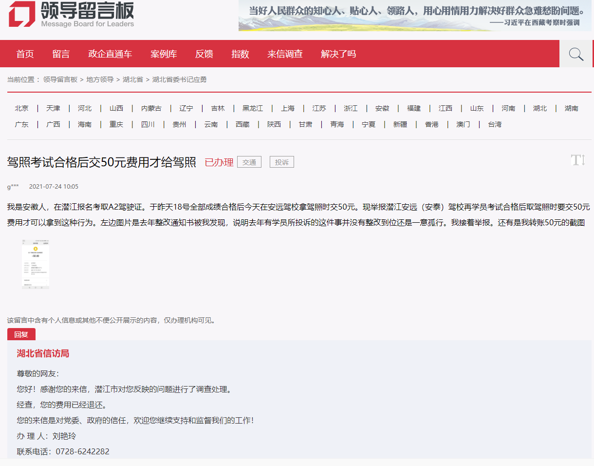 人民網(wǎng)武漢11月8日電 (周雯)考試合格領(lǐng)取駕照時(shí),卻被駕校告知要交50元才能領(lǐng)?近日,有網(wǎng)友在人民網(wǎng)“領(lǐng)導(dǎo)留言板”給湖北省委書記板塊留言反映該問題,對此,官方回復(fù)表示,已退還該費(fèi)用。
