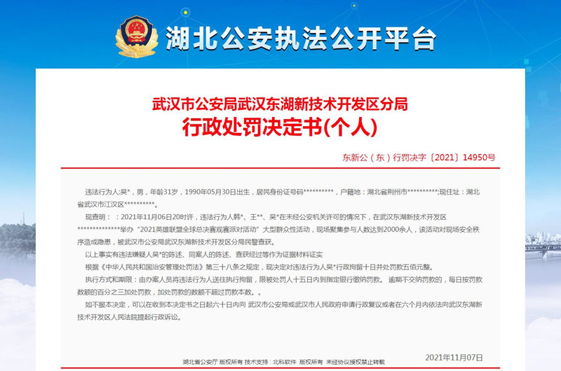 人民網(wǎng)武漢11月9日電 (肖璐欣)英雄聯(lián)盟2021全球總決賽11月6日晚舉行,在武漢光谷步行街的同步直播現(xiàn)場人山人海。9日,武漢市公安局武漢東湖新技術(shù)開發(fā)區(qū)分局在湖北公安執(zhí)法公開平臺(tái)上發(fā)布行政處罰決定書,3名違法行為人在未經(jīng)公安機(jī)關(guān)許可的情況下,舉辦“2021英雄聯(lián)盟全球總決賽觀賽派對活動(dòng)”大型群眾性活動(dòng),現(xiàn)場聚集參與人數(shù)達(dá)到2000余人,該活動(dòng)對現(xiàn)場安全秩序造成隱患,被民警查處。