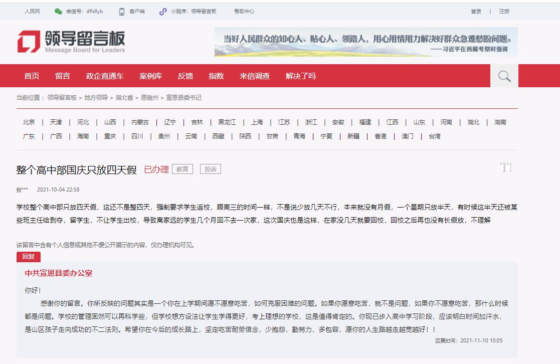 人民網(wǎng)武漢11月12日電 (周雯)“學(xué)校整個(gè)高中部只放四天假,本來就沒有月假,一個(gè)星期只放半天,有時(shí)候這半天還被某些班主任給剝奪……”近日,有網(wǎng)友在人民網(wǎng)“領(lǐng)導(dǎo)留言板”給湖北省宣恩縣委書記留言“吐槽”:高中放假時(shí)間頻頻縮短,有的住得遠(yuǎn)的學(xué)生幾個(gè)月回不了家。對(duì)此,中共宣恩縣委辦公室回復(fù):“你現(xiàn)已步入高中學(xué)習(xí)階段,應(yīng)該明白時(shí)間加汗水,是山區(qū)孩子走向成功的不二法則!