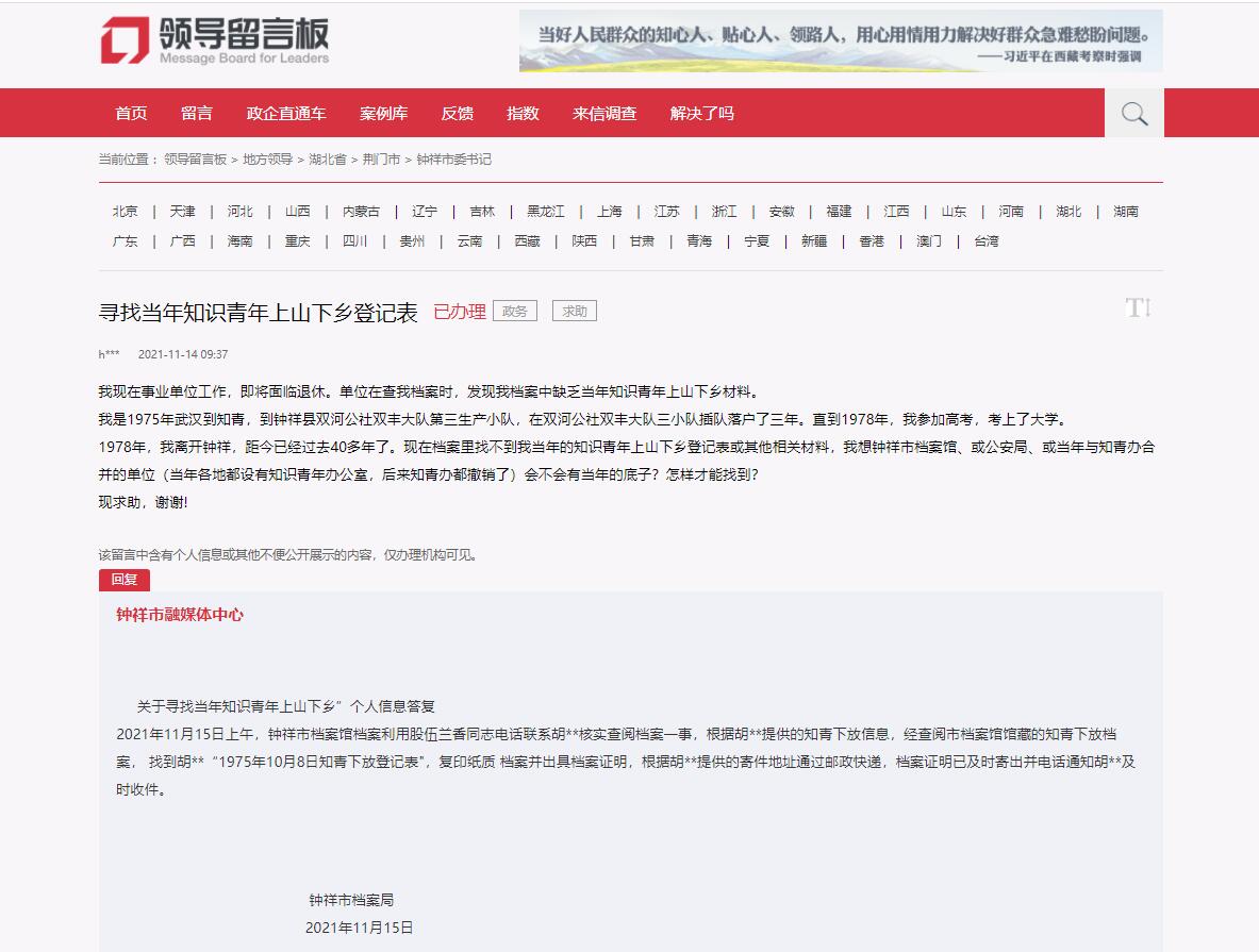 人民網(wǎng)武漢11月18日電 (關(guān)喜艷)日前,一網(wǎng)友在人民網(wǎng)“領(lǐng)導(dǎo)留言板”留言,尋找自己40多年前作為知青上山下鄉(xiāng)時(shí)的登記表。經(jīng)湖北省鐘祥市檔案館工作人員尋找,已經(jīng)找到相關(guān)材料并郵寄給當(dāng)事人。