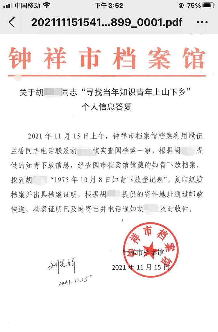 11月15日上午,鐘祥市檔案館工作人員電話聯(lián)系上該網(wǎng)民。根據(jù)其提供的信息,經(jīng)仔細(xì)查閱市檔案館館藏的知青下放檔案,工作人員成功找到該網(wǎng)民“1975年10月8日知青下放登記表”,遂復(fù)印紙質(zhì)檔案同時(shí)出具檔案證明,根據(jù)其提供的地址寄出快遞,并電話通知其及時(shí)收件。