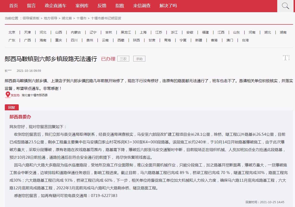 網(wǎng)友給十堰市委書記留言反映的交通問題,鄖西縣委辦作出詳細回復(fù):“網(wǎng)友您好,收到您的留言后,我們立即與縣交通局取得聯(lián)系,經(jīng)縣交通局調(diào)查核實,馬安至六郎段改擴建工程項目全長28.1公里,除橋、隧工程以外路基長26.54公里,目前已成型路基23.5公里,剩余工程量主要集中在馬安鎮(zhèn)白家山村花櫟崗K3+300至K4+000段路基。該段施工長約240米,于10月14日開始路基爆破施工,由于此次爆破方量大,采取分段爆破,原有老路在改線路基范圍內(nèi),路基需下降,爆破后六郎至馬安交通暫時中斷,目前現(xiàn)場正在組織機械、人員加班加點全力搶通此段路基,預(yù)計10月28日前搶通,道路搶通后在符合安全通行的前提下,將盡快恢復(fù)班線客運。因馬六路和六大路大多路段為臨水臨崖路段,受地形及施工作業(yè)面限制,難以全面開展機械作業(yè),只能分段施工,加之路基開挖斷面高,爆破方量大,一旦爆破施工就會中斷交通,邊坡排險和道路保通任務(wù)艱巨,影響工程進度。截止(至)目前,馬六路路基工程已完成89%,橋梁工程已完成70%,隧道工程完成30%,路面工程完成30%;六大路路基工程已完成93%,橋梁工程已完成60%,下一步,相關(guān)單位將督促施工單位加大機械和人力投入力度,確保馬六路11月底完成路基工程,六大路12月底前完成路基工程,2022年3月底前完成馬六路和六大路剩余橋、隧及路面工程!