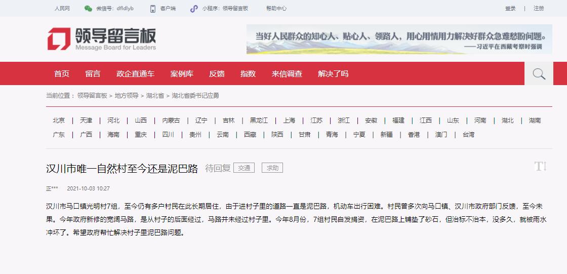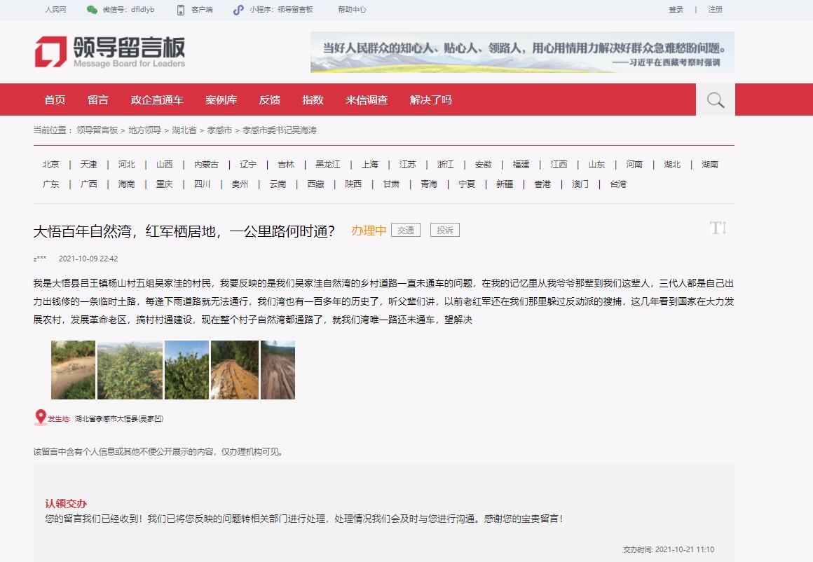 10月9日,網(wǎng)友給孝感市委書記留言:“大悟百年自然灣,紅軍棲居地,一公里路何時通?我是大悟縣呂王鎮(zhèn)楊山村五組吳家洼的村民,我要反映的是我們吳家洼自然灣的鄉(xiāng)村道路一直未通車的問題,在我的記憶里從我爺爺那輩到我們這輩人,三代人都是自己出力出錢修的一條臨時土路,每逢下雨道路就無法通行,我們?yōu)骋灿幸话俣嗄甑臍v史了,聽父輩們講,以前老紅軍還在我們那里躲過反動派的搜捕,這幾年看到國家在大力發(fā)展農(nóng)村,發(fā)展革命老區(qū),搞村村通建設(shè),現(xiàn)在整個村子自然灣都通路了,就我們?yōu)澄ㄒ宦愤未通車,望解決。”