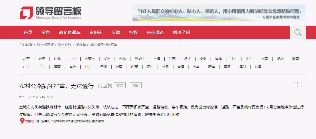 10月16日,網(wǎng)友給省委書記留言:“農(nóng)村公路損壞嚴(yán)重,無法通行。宜城市龍頭街道鐵湖村十一組進村道路年久失修,坑坑洼洼,下雨天積水嚴(yán)重,道路狹窄,會車?yán)щy。做為進出村的唯一道路,嚴(yán)重影響村民出行!8月份當(dāng)?shù)孛襟w也進行過報道,但是當(dāng)?shù)卣两褚廊粺o動于衷,望政府能盡快修復(fù)損壞的道路,解決老百姓出行困難。”