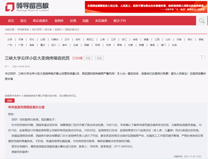 “書記您好,三峽大學(xué)云祥小區(qū)大圣燒烤每天晚上經(jīng)營到凌晨3點(diǎn),其后廚的各種噪音嚴(yán)重?cái)_民!本人也一直在投訴,但是他們還是我行我素!望為人民做主!還居民安靜休息環(huán)境。”10月9日,網(wǎng)友在人民網(wǎng)“領(lǐng)導(dǎo)留言板”上給湖北省宜昌市西陵區(qū)委書記反映噪音擾民問題,盼為解決。