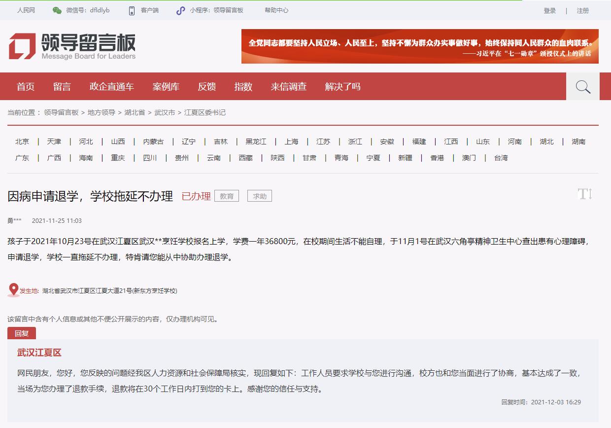 人民網(wǎng)武漢12月6日電 (周雯)孩子因病申請(qǐng)退學(xué),學(xué)校卻一直拖延不辦理……近日,有網(wǎng)友在人民網(wǎng)“領(lǐng)導(dǎo)留言板”上向湖北省武漢市江夏區(qū)委書記留言,希望能協(xié)助其辦理退學(xué)。留言后,經(jīng)過相關(guān)職能部門介入,已為其辦理退學(xué)手續(xù),退款將在30個(gè)工作日內(nèi)退還。