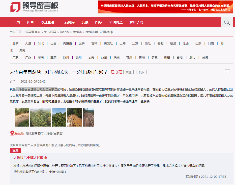 人民網(wǎng)武漢12月7日電 (郭婷婷)百年自然灣,紅軍棲居地,最后一公里出村路卻遲遲難通。近日,來(lái)自湖北大悟縣呂王鎮(zhèn)楊山村五組吳家洼的村民,向人民網(wǎng)“領(lǐng)導(dǎo)留言板”反映所在村鄉(xiāng)村道路一直未通車(chē)的問(wèn)題。大悟縣呂王鎮(zhèn)人民政府回稱(chēng)復(fù),通往吳家洼自然灣的鄉(xiāng)村道路已于當(dāng)月正式開(kāi)工修建。