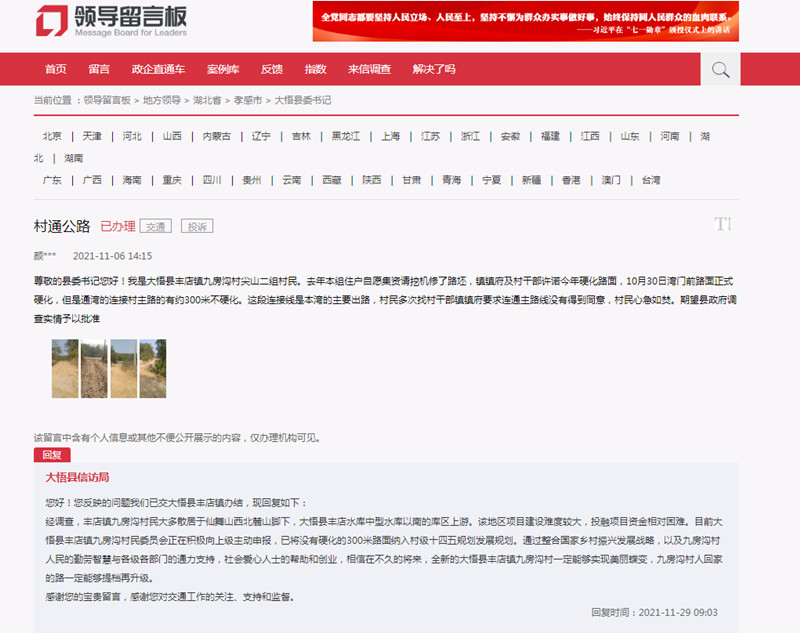 記者梳理人民網(wǎng)“領(lǐng)導(dǎo)留言板”發(fā)現(xiàn),該縣其他地方也存在關(guān)于村級(jí)公路建設(shè)方面的問(wèn)題。