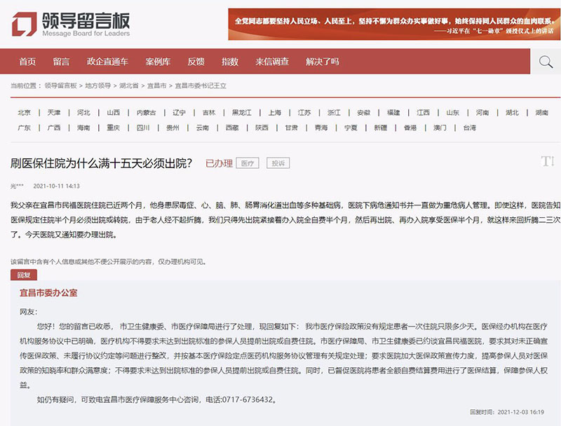 人民網(wǎng)武漢12月7日電 (肖璐欣)醫(yī)保規(guī)定住院半個月必須出院或轉(zhuǎn)院,危重病人住院半個月就要求出院再辦理入院?近日,一網(wǎng)友在人民網(wǎng)“領導留言板”反映醫(yī)保住院每半個月要出院再入院問題。針對網(wǎng)友留言,湖北省宜昌市衛(wèi)生健康委、市醫(yī)療保障局回復稱,醫(yī)療保險政策沒有規(guī)定患者每次住院天數(shù),已約談涉事醫(yī)院,要求其對相關問題進行整改。