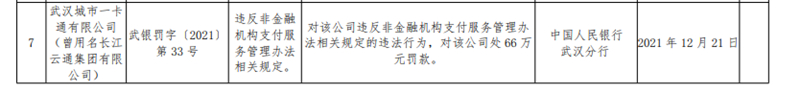 人民網(wǎng)武漢12月27日電 據(jù)中央人民銀行網(wǎng)站近日公布的中國(guó)人民銀行武漢分行行政處罰信息公示表(武銀罰字〔2021〕第33號(hào))顯示,武漢城市一卡通有限公司(曾用名長(zhǎng)江云通集團(tuán)有限公司)違反非金融機(jī)構(gòu)支付服務(wù)管理辦法相關(guān)規(guī)定。中國(guó)人民銀行武漢分行對(duì)該公司處66萬(wàn)元罰款。