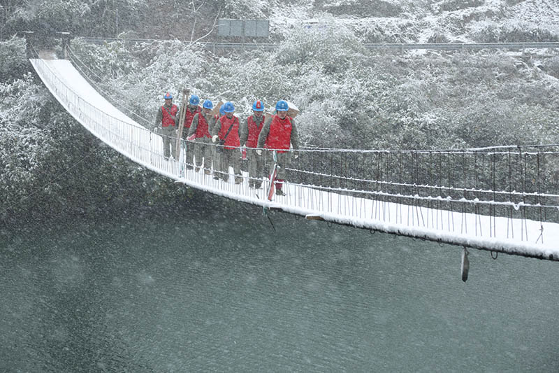 國(guó)網(wǎng)湖北電力(林麗)共產(chǎn)黨員服務(wù)隊(duì)冒雪踏過“甩甩橋”去整改線路。李伶俐攝