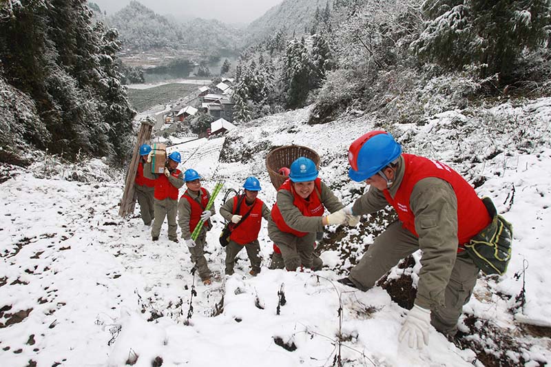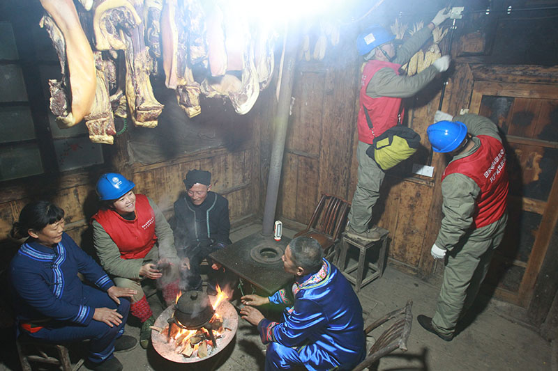 國(guó)網(wǎng)湖北電力(林麗)共產(chǎn)黨員服務(wù)隊(duì)冒雪進(jìn)山為村民實(shí)施室內(nèi)電力線路整改。張家廣攝