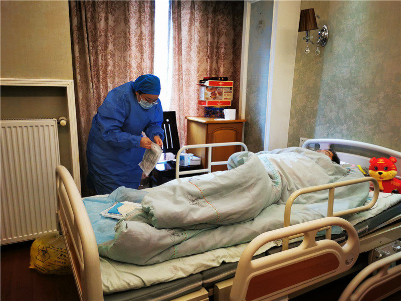 這是秦敏第三次到壽奶奶家里進(jìn)行護(hù)理服務(wù)。在門口,秦敏和丁琳按工作流程拿出工作證先介紹了自己,然后拿出手機(jī)核對(duì)了訂單。在評(píng)估完成,家屬簽好知情同意書后,秦敏和丁琳在門口脫下厚厚的外套,換上白大褂,套上鞋套,手消毒后,再穿戴上一次性帽子、隔離衣和手套,才進(jìn)了壽奶奶的房間。