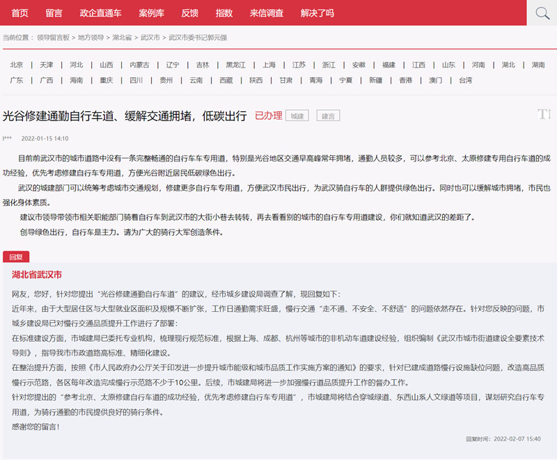 網(wǎng)友建言加強(qiáng)自行車(chē)道建設(shè) 武漢:已部署