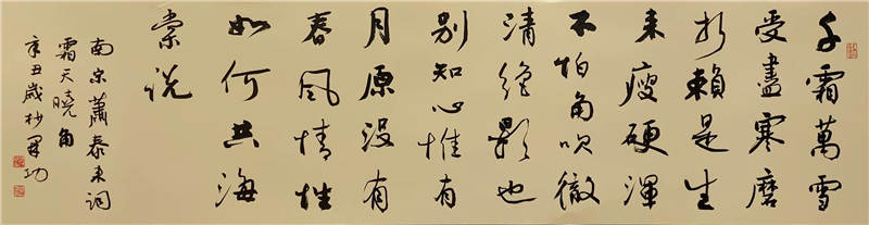 問道香翰墨,擷詩賦江城。魏開功以深厚的學養(yǎng),魏碑風骨般的人格魅力,以及篤定頑強的拼搏精神,在漫長而艱辛的五十余載筆墨生香的歲月里,沉浸式抒發(fā)自我誠摯的思想情懷。在寧靜孤獨中淡看塵世蒼茫,在文字的有機構成中抽取詞根的精神風度,書法家和詩人的魏開功顯然已經開辟了屬于他的藝術領地。精于書法,研習詩歌,樂于二胡演奏等,這些開闊多維的藝術形式和情感域場,都愈加精粹地體現一個藝術家創(chuàng)作的噴發(fā)狀態(tài),激情悅暢,韌性理智,敢于深入生命孤獨之境感知,發(fā)現和體悟!笆旰翱唷蔽洪_功始終向著心中的詩書圣地超拔和躍升,也從隱忍和歷練中不斷淬煉達觀和通透的人生智慧,只有用思想精神培植的抒寫才可以是生生不息的,在魏開功深刻和勃發(fā)的秘密思想花園,正在孕育屬于他的形而上的詩書藝術之美。“神性的詩寫”是仰望星空的禪意,在與瑣碎生活握手言和,與禪靜修持與共的平衡里,魏開功正在對現世和生命摹寫屬于自我使命召喚的,嶄新的時代華章。(陳啊妮)