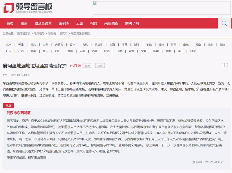 人民網(wǎng)武漢3月10日電 (周雯)陽春三月,正是踏青的好時(shí)節(jié)。武漢市東西湖區(qū)境內(nèi)的府河濕地公園正值枯水期,裸露的河床吸引很多市民前往踏青!按杭局苣┐罅咳藛T踏青致遍地垃圾,堤壩擁堵不堪,建議加強(qiáng)管理!3月4日,有群眾在人民網(wǎng)“領(lǐng)導(dǎo)留言板”留言表示。對此,武漢市東西湖區(qū)立馬進(jìn)行了部署,并對該群眾的建議一一進(jìn)行了安排。
