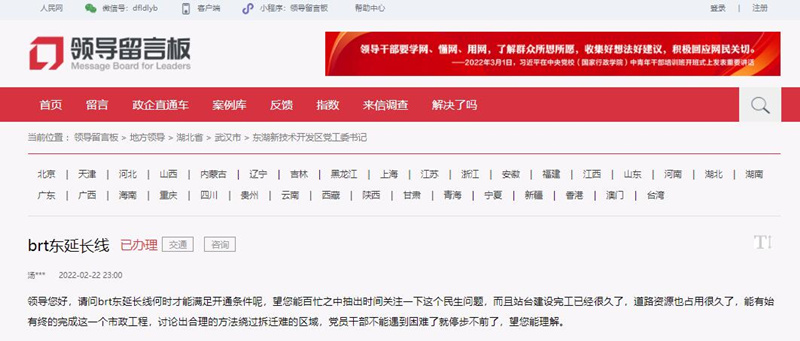 人民網(wǎng)武漢3月13日電 (關(guān)喜艷)日前,一網(wǎng)友在人民網(wǎng)“領(lǐng)導(dǎo)留言板”武漢市東湖新技術(shù)開發(fā)區(qū)黨工委書記板塊下留言,詢問該市BRT東延長線何時開通。對此,該區(qū)信訪局回應(yīng):9月建成完工,后續(xù)收尾調(diào)試工作完成后將實(shí)現(xiàn)全線貫通。對于回復(fù),網(wǎng)友給出滿意評價。