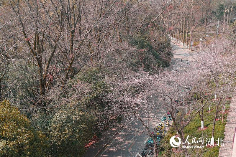 武漢大學(xué)櫻花大道上櫻花初綻。人民網(wǎng) 金雨蒙攝