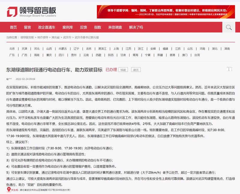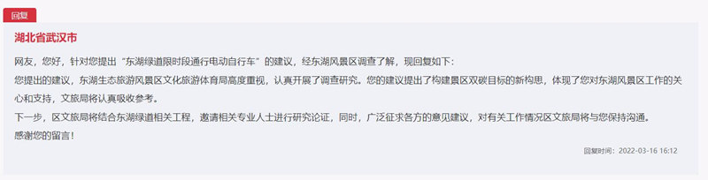 人民網(wǎng)武漢3月21日電 (周雯)“推進(jìn)電動(dòng)自行車通勤,能有效解決武漢現(xiàn)階段交通擁擠等問題,建議武漢東湖綠道實(shí)行限時(shí)電動(dòng)自行車通行,方便東湖兩岸居民通勤!苯,有群眾在人民網(wǎng)“領(lǐng)導(dǎo)留言板”上留言,并提出了5條詳細(xì)建議。對(duì)此,武漢市回復(fù)稱,該建議構(gòu)建了景區(qū)雙碳目標(biāo)的新構(gòu)思,將認(rèn)真吸收參考。