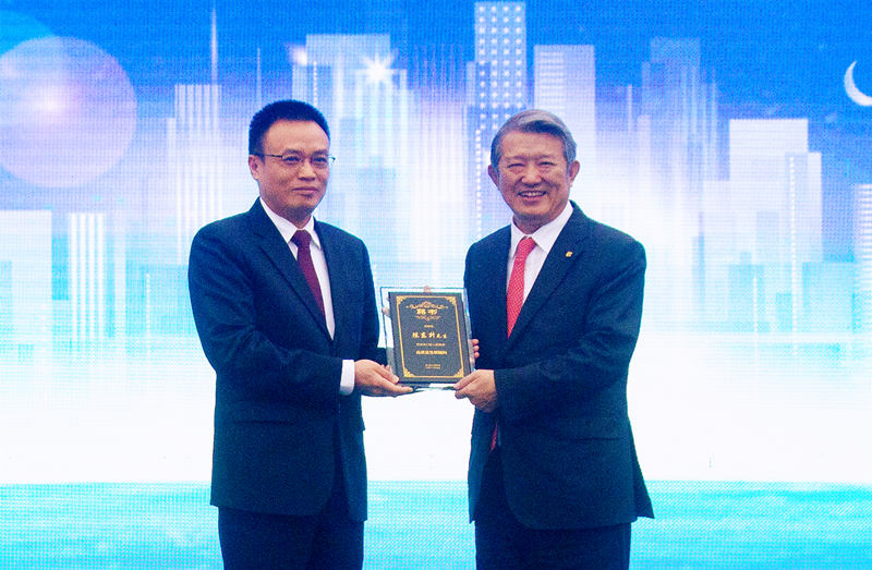 天門市委書記給楚商聯(lián)合會會長陳東升頒發(fā)聘書。劉銀斌攝