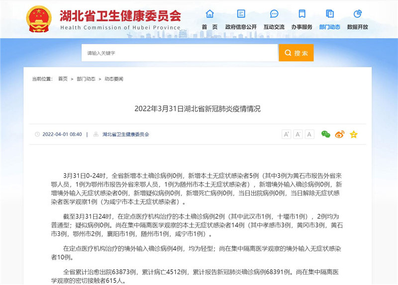 人民網(wǎng)武漢4月1日電 (周倩文、周恬)4月1日,據(jù)湖北省衛(wèi)生健康委員會(huì)官網(wǎng)發(fā)布,3月31日0-24時(shí),全省新增本土確診病例0例,新增本土無(wú)癥狀感染者5例(其中3例為黃石市報(bào)告外省來(lái)鄂人員,1例為鄂州市報(bào)告外省來(lái)鄂人員,1例為隨州市本土無(wú)癥狀感染者),新增境外輸入確診病例0例,新增境外輸入無(wú)癥狀感染者0例,新增疑似病例0例,新增死亡病例0例,當(dāng)日出院病例0例,當(dāng)日解除無(wú)癥狀感染者醫(yī)學(xué)觀察1例(為咸寧市本土無(wú)癥狀感染者)。