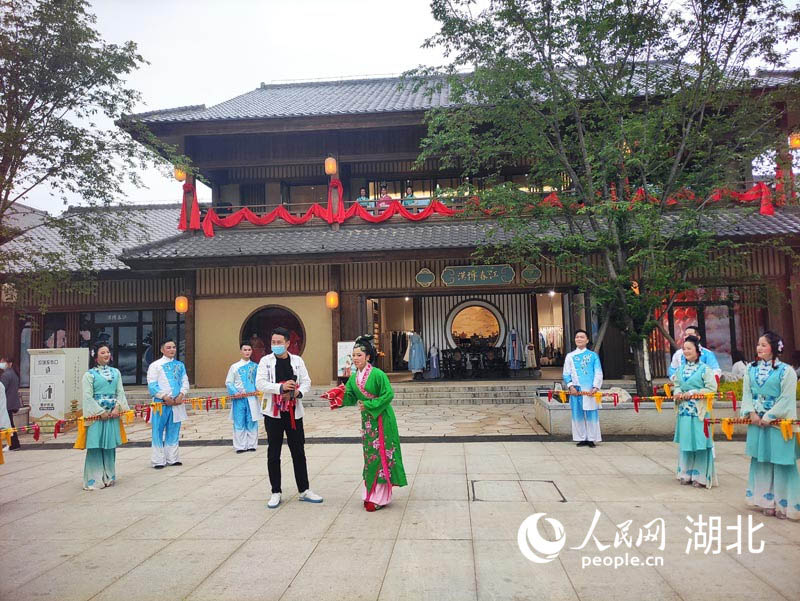 在鄂旅投東山小鎮(zhèn),為游客專門排演的黃梅戲、打連廂正在上演。