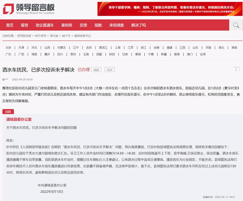 人民網(wǎng)武漢5月21日電 (周雯)“灑水車每天午休時間段作業(yè)時會多次響起音樂,因臨近幼兒園,嚴重打擾幼兒及附近居民休息!苯眨芯W(wǎng)友在人民網(wǎng)“領導留言板”給湖北省通城縣委書記板塊留言反映,灑水車噪音已嚴重擾民,希望有關部門予以解決。對此,湖北省通城縣回復表示,已將環(huán)衛(wèi)工作人員作業(yè)時間調(diào)整為14:30至16:30,同時要求灑水車司機在經(jīng)過此幼兒園前后150米時,將音樂關閉。