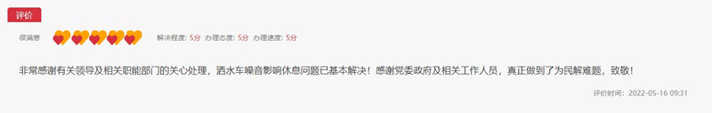 對于該問題的處理,該網(wǎng)友再度留言給予“五星”好評,并表示“非常感謝有關領導及相關職能部門的關心處理,灑水車噪音影響休息問題已基本解決!”