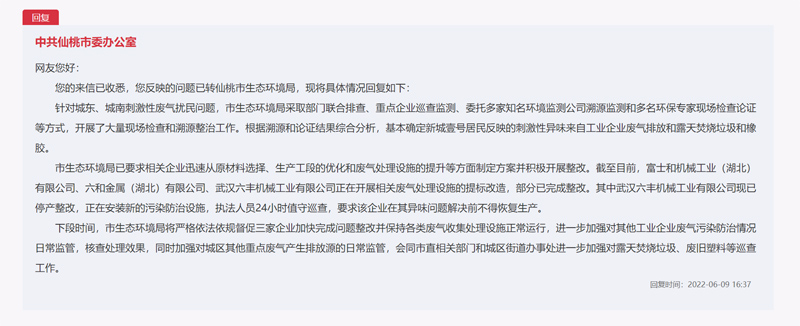 仙桃市生態(tài)環(huán)境局采取部門聯(lián)合排查、重點(diǎn)企業(yè)巡查監(jiān)測、委托多家知名環(huán)境監(jiān)測公司溯源監(jiān)測和多名環(huán)保專家現(xiàn)場檢查論證等方式,開展了大量現(xiàn)場檢查和溯源整治工作。根據(jù)溯源和論證結(jié)果綜合分析,基本確定新城壹號(hào)居民反映的刺激性異味來自工業(yè)企業(yè)廢氣排放和露天焚燒垃圾、橡膠。