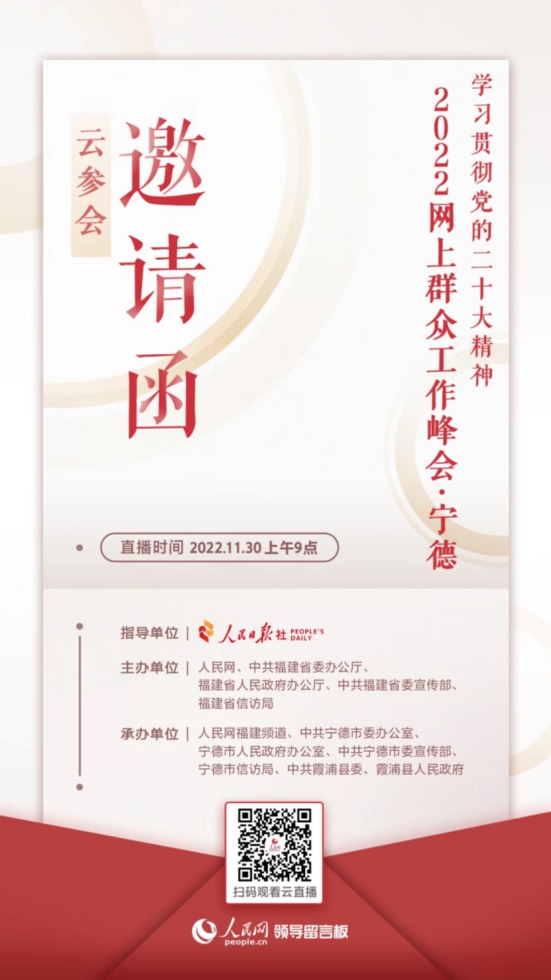 人民網(wǎng)北京11月23日電(記者 曾帆)為深入學(xué)習(xí)貫徹黨的二十大精神,由人民日?qǐng)?bào)社指導(dǎo),人民網(wǎng)、中共福建省委辦公廳、福建省人民政府辦公廳、中共福建省委宣傳部、福建省信訪局主辦的2022網(wǎng)上群眾工作峰會(huì)將于11月30日在福建省寧德市舉行。