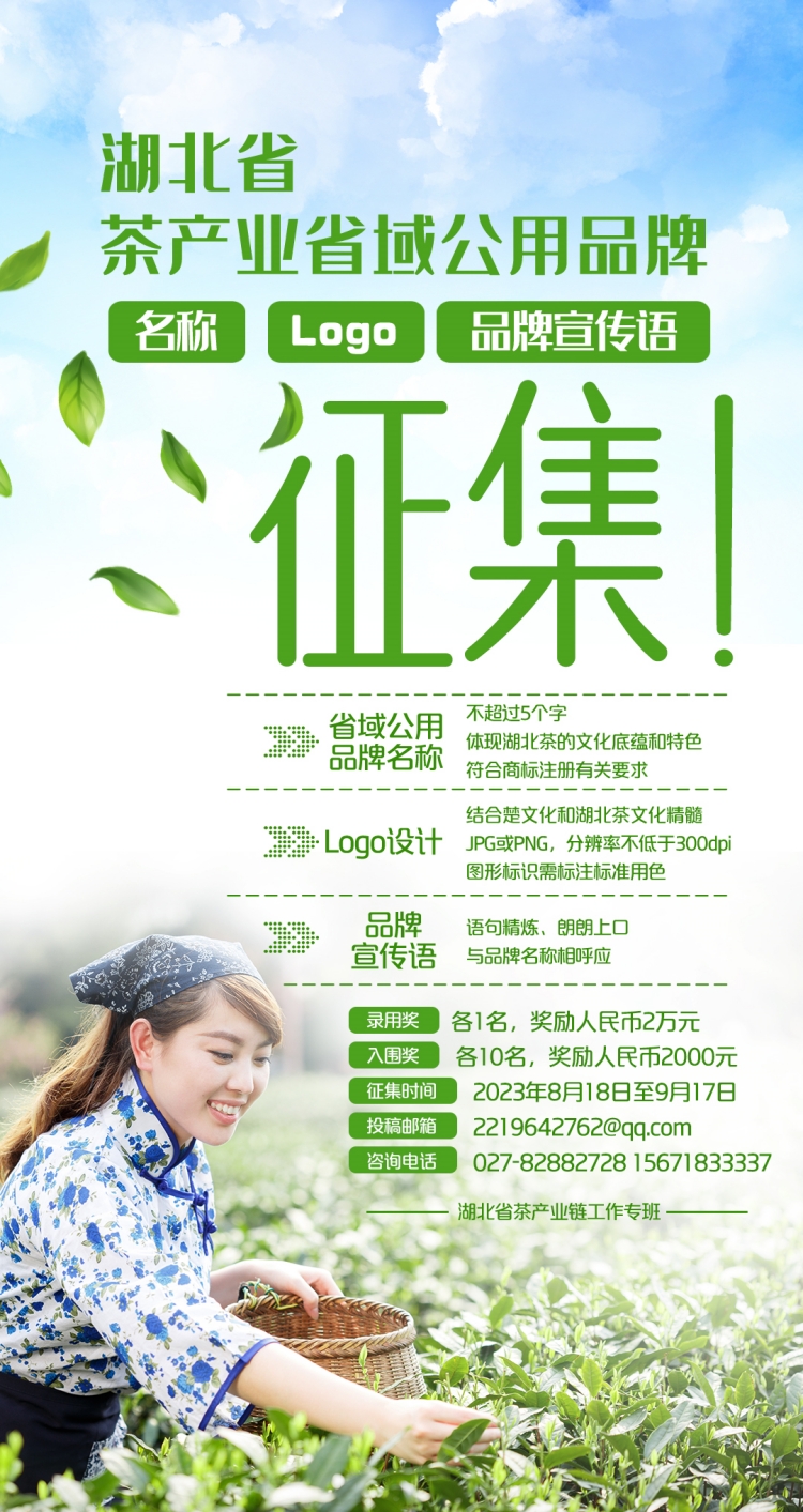 針對(duì)湖北省茶產(chǎn)業(yè)省域公用品牌,8月18日至9月17日,省茶產(chǎn)業(yè)鏈工作專(zhuān)班面向全社會(huì)公開(kāi)征集名稱(chēng)、Logo及品牌宣傳語(yǔ)。參與者可單項(xiàng)或多項(xiàng)聯(lián)合投稿,三項(xiàng)分別設(shè)置錄用獎(jiǎng)各1名,獎(jiǎng)勵(lì)人民幣2萬(wàn)元;入圍獎(jiǎng)各10名,獎(jiǎng)勵(lì)人民幣2000元。