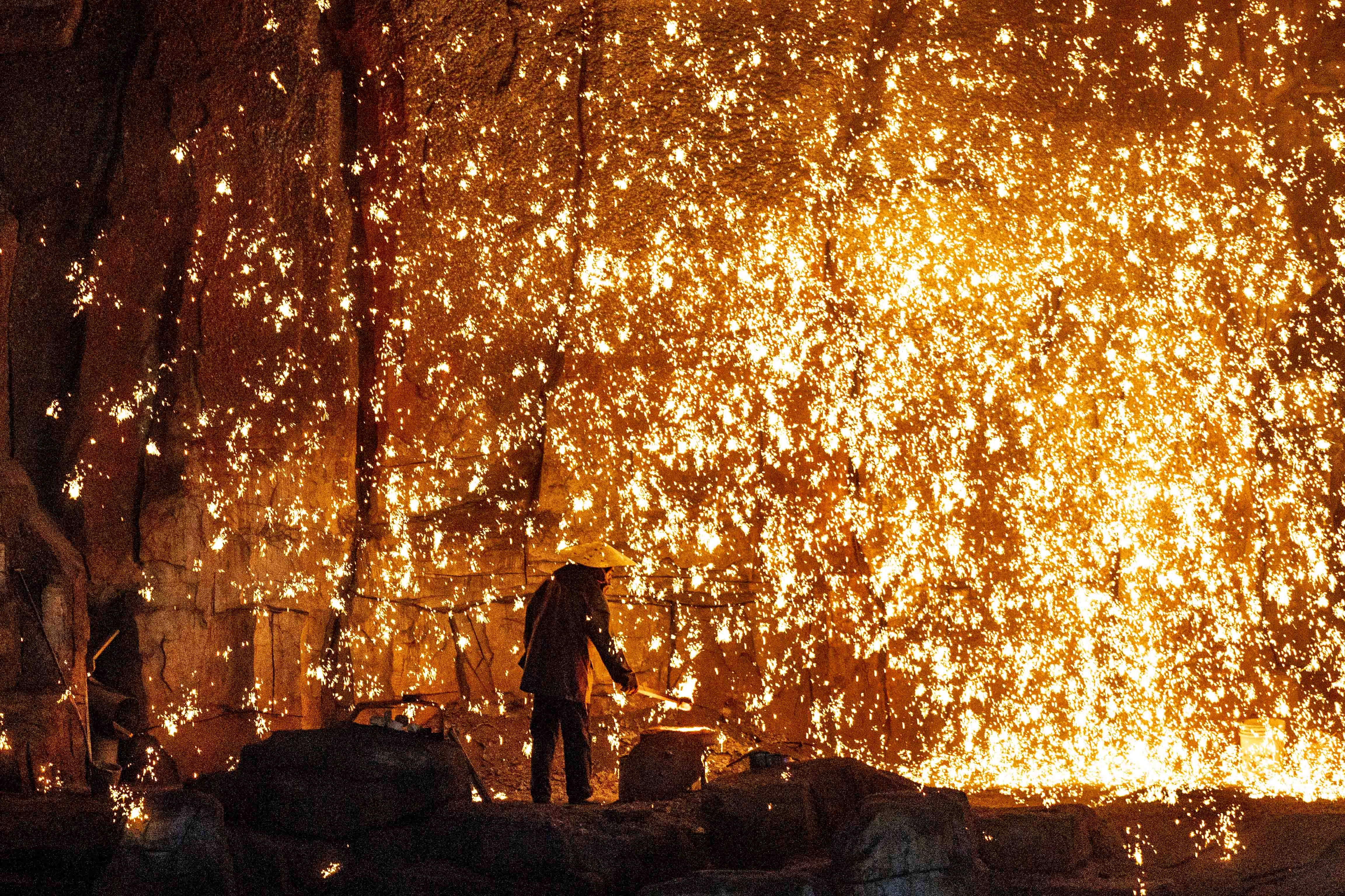 鐵樹銀花中的打鐵花技人。